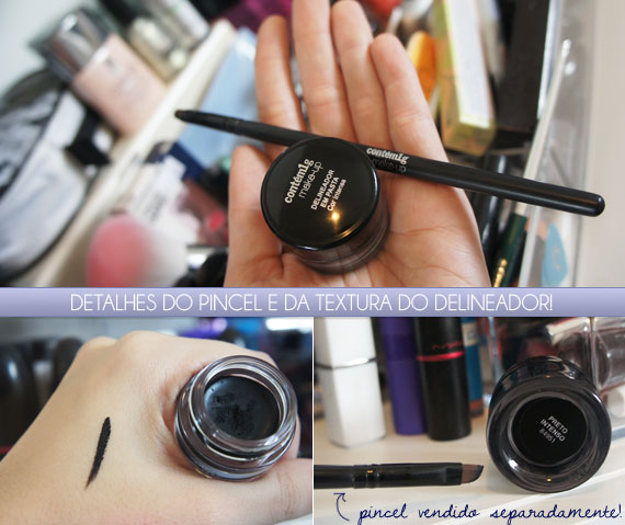 O delineador custa R$42 e não vem com pincel, tem que desembolsar mais R$17! Mas vale muito a pena, pois a facilita horrores a aplicação e faz um traço mais preciso. A textura em creme é intensa e com apenas uma “passada”, o efeito já fica perfeito: super-ultra-mega pretão e opaco! Show!