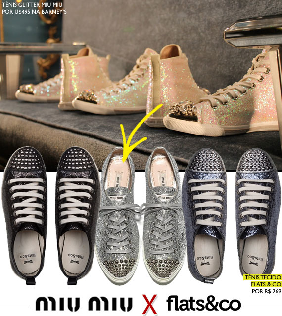 Não sei vocês, mas eu sou piradinha da silva nos sapatos da Miu Miu. Qualquer um deles! E geralmente é tudo com glitter, então demorou já é! hehe Só tem um pequeno detalhezito que atrapalha minha vida: o preço! São muitas centenas de dólares pra investir em uma peça nada básica né? Não é que nem um scarpin preto que a gente acaba usando até furar…