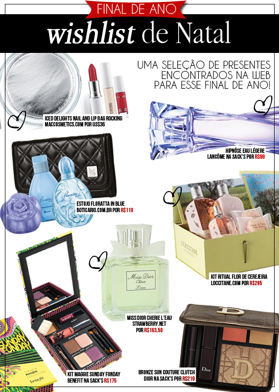 N’O Boticário, meu favorito é o kit Floratta in Blue, o perfume é muito bom e me traz lembranças boas! Muito bom para usar no dia-a-dia, e ainda vem com uma clutch bem bacana! No Strawberry.net não precisa nem falar né? Perfumes e makes importadas com preços mais amigos! O único problema é que a entrega demora um pouquinho, então talvez as compras não cheguem a tempo… mas é melhor comprar algo bem massa e dar mesmo estando atrasado do que não agradar muito com um presente qualquer, não é não?!